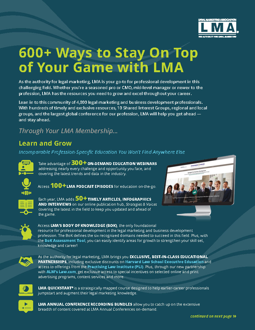 Now is the perfect time to explore the value of the Legal Marketing Association (LMA). Whether you’re just starting out, building your expertise, leading a team or consulting, LMA is your ultimate hub for professional development, networking and industry insights.