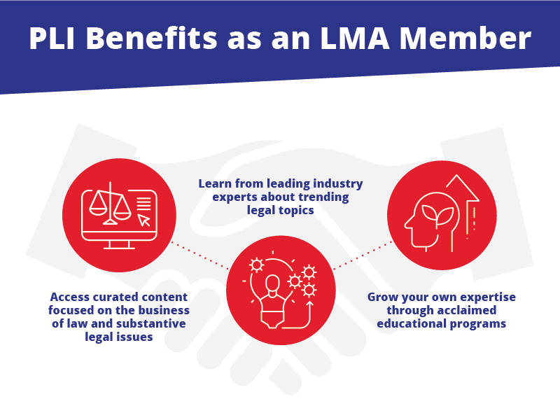 LMA is proud to partner with Practising Law Institute (PLI), a leading nonprofit learning organization in the legal industry, to offer new, complimentary educational offerings to LMA members. A renowned resource for attorneys and other professionals, PLI offers the highest-quality, accredited, continuing legal and professional education programs featuring volunteer speakers who are widely recognized as leading experts in their field.